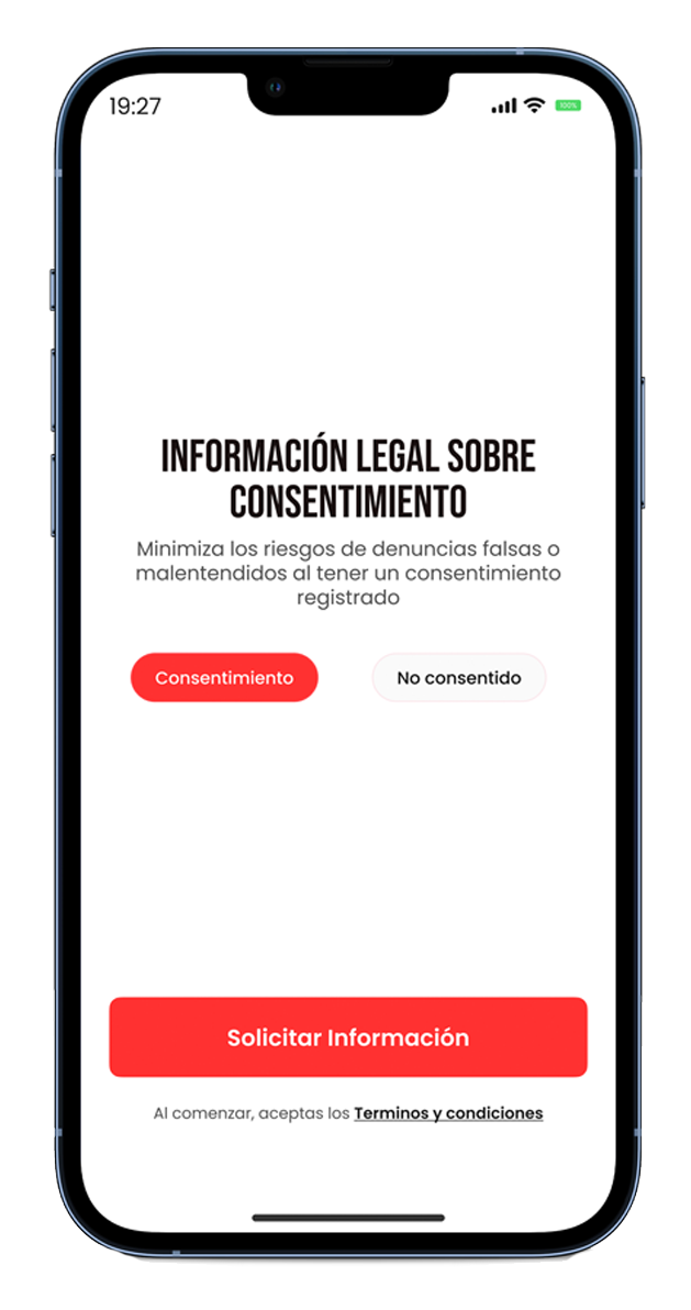 Nuestra plataforma permite a las personas documentar su consentimiento explícito en una relación sexual mediante la subida de un video corto. Este vídeo se guarda en una nube encriptada y se hace accesible únicamente a las partes involucradas mediante un código único que se enviará a ambas por correo electrónico. Este vídeo solo podrá ser utilizado en caso de una denuncia legal y se eliminará automáticamente después de 6 meses.